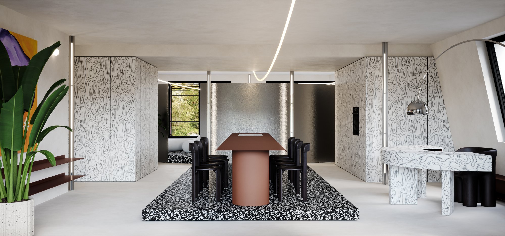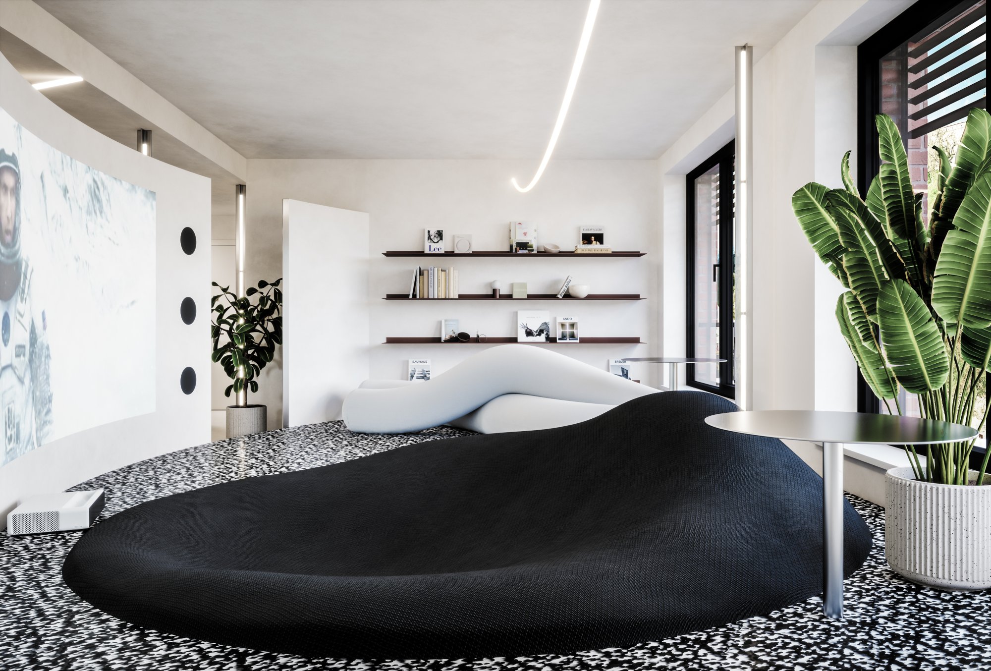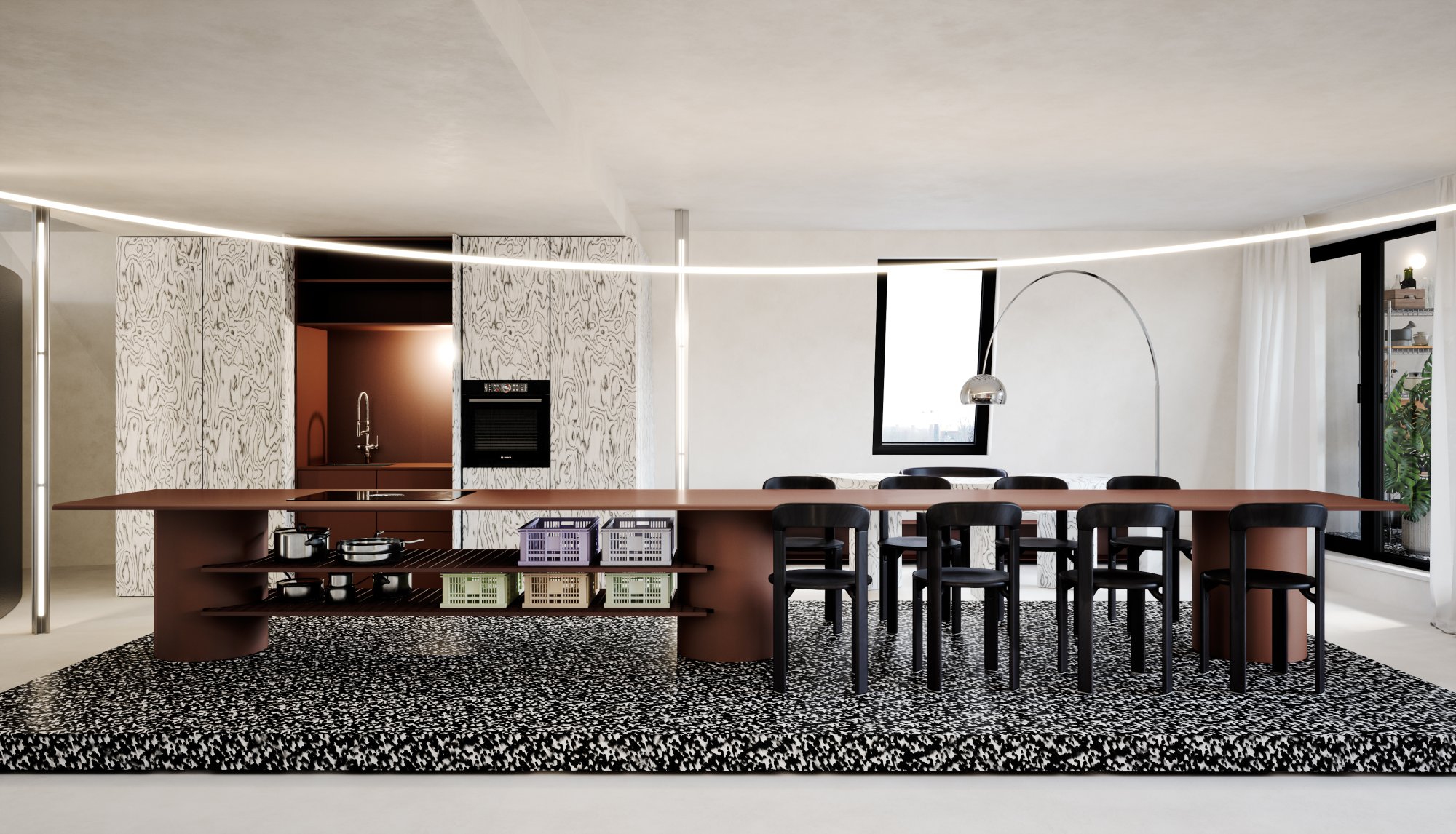 The guiding principle of the design was to avoid conventional compartmentalization. Instead, the apartment maintains a sense of openness by distinguishing the primary zones—day and night activities—using subtle horizontal platforms. This preserves the spaciousness and grandeur of a contemporary loft while offering a seamless transition between different uses. The result is a sophisticated, modern living environment that balances openness with function, emphasizing the luxury of space and the fluidity of modern urban living.